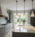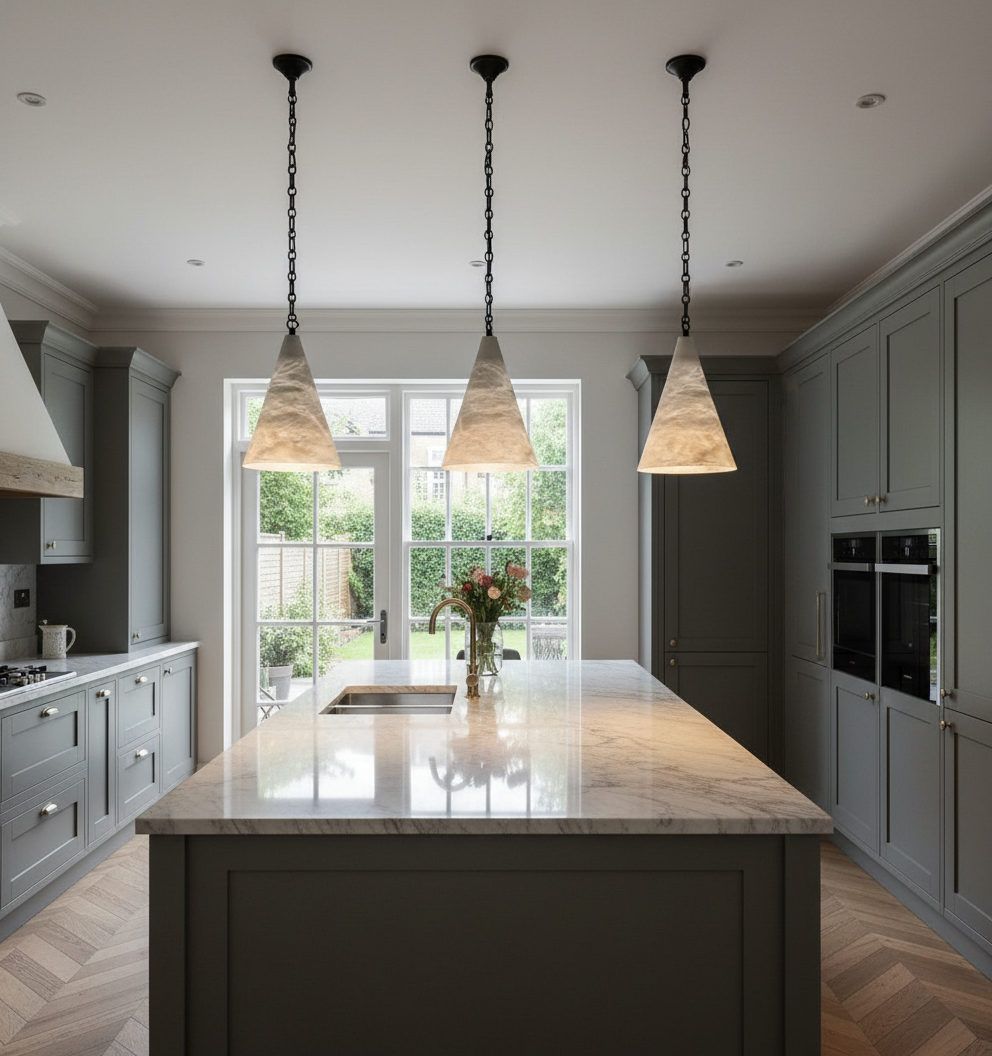 Each pendant is crafted from genuine Alabaster stone, with natural veining that makes every piece unique. When illuminated, the stone diffuses light with a warm translucence — a refined choice for kitchens, dining areas, stairwells, or feature installations.