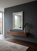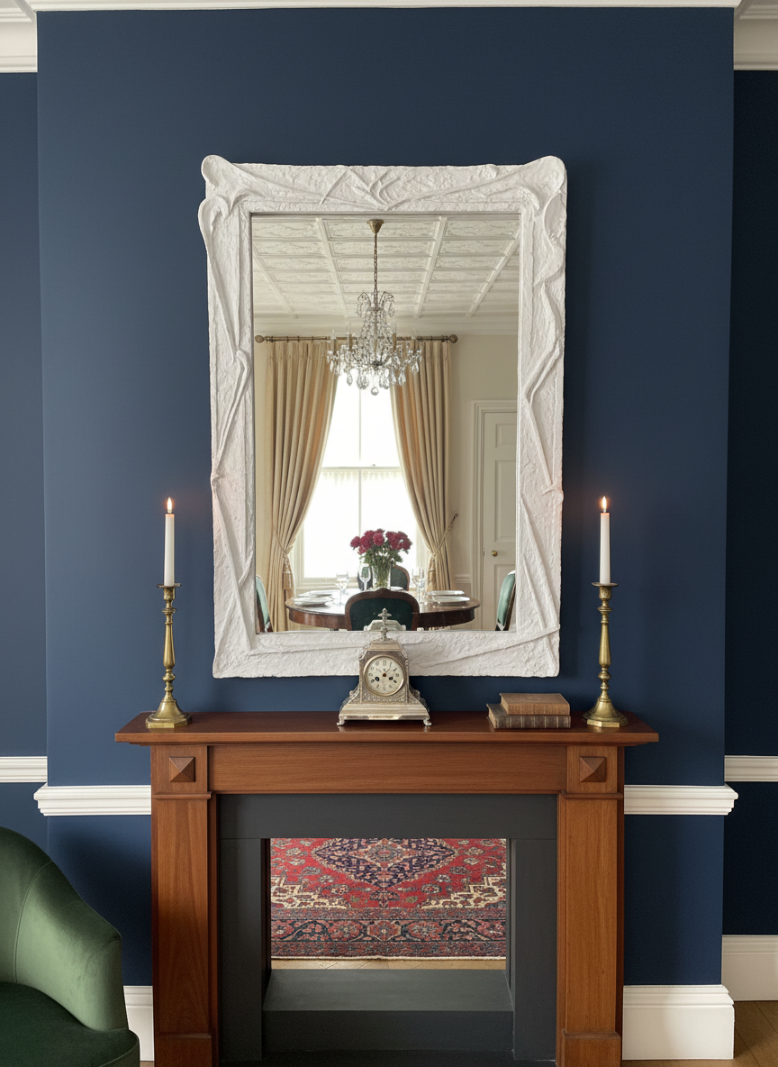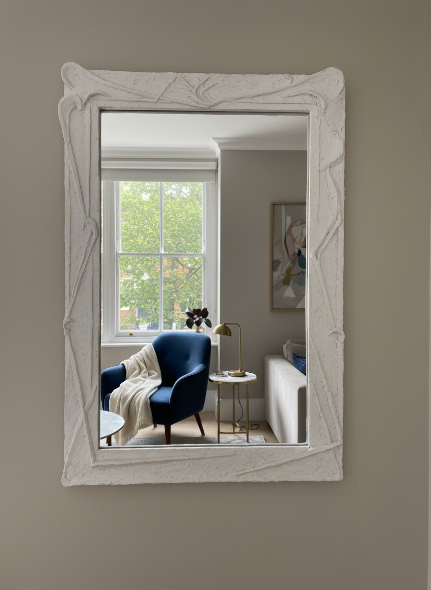The mirror’s quiet, architectural form integrates seamlessly with modern, minimalist, rustic, French modernist, and eclectic interiors. It functions both as a practical mirror and as a sculptural decorative object.