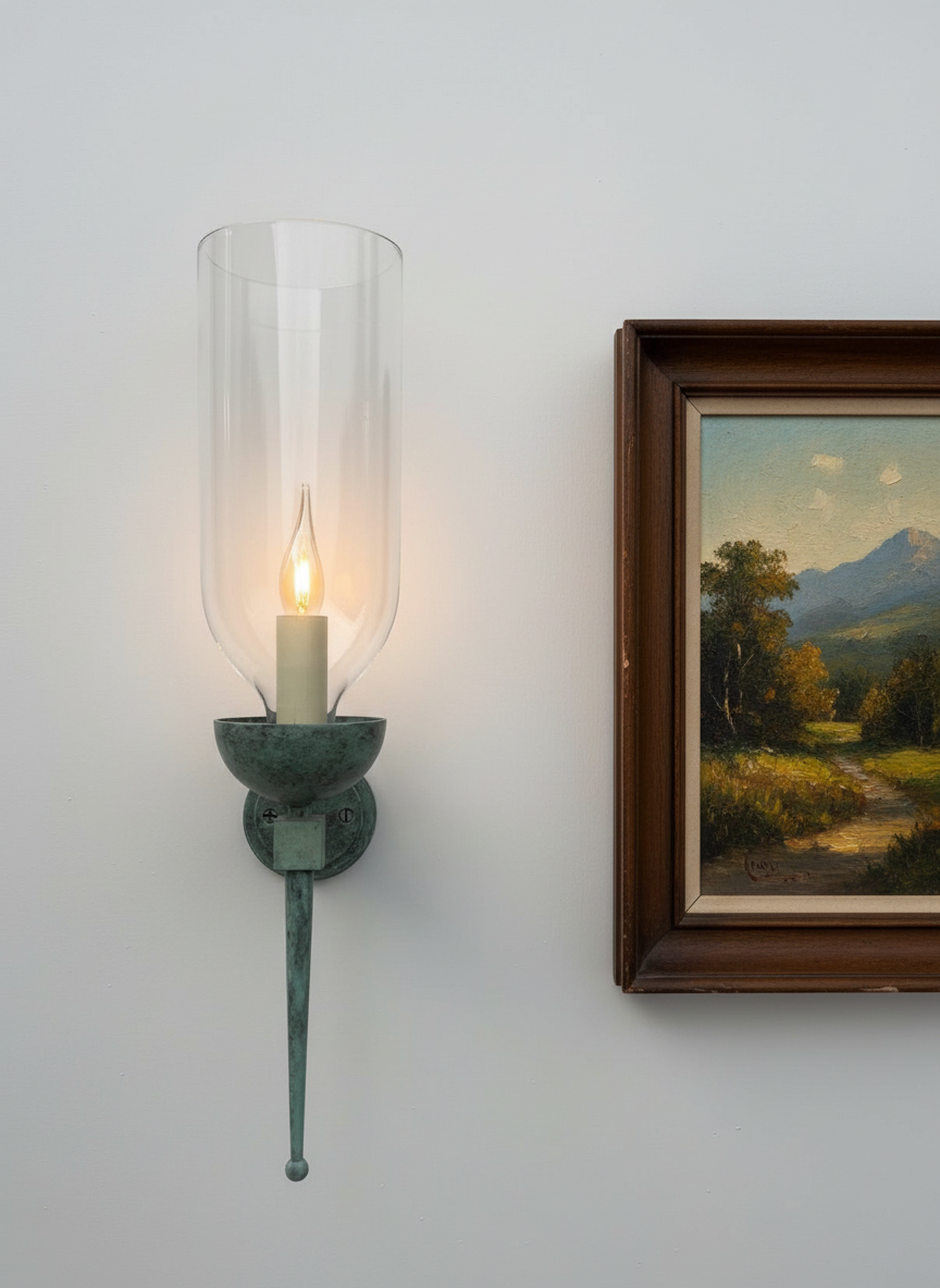 - Material: Verdigris-patinated metal and clear glass