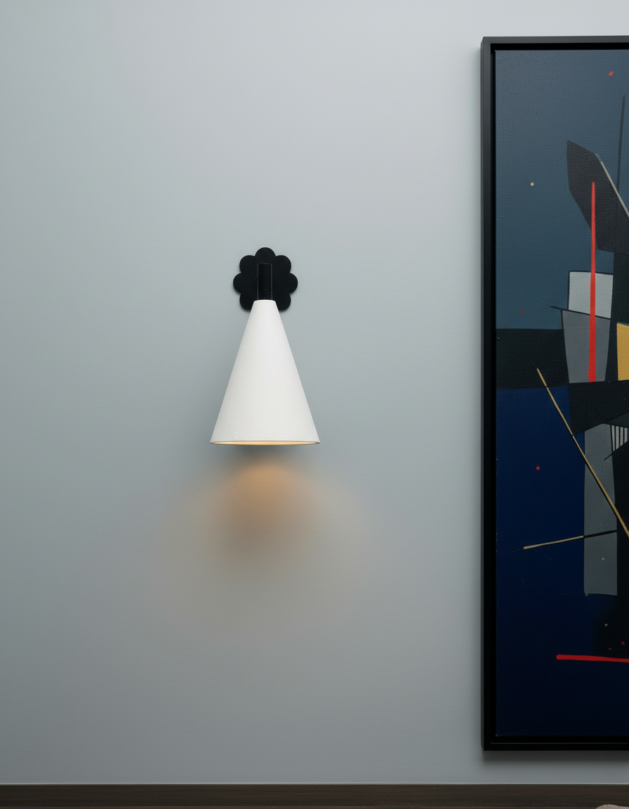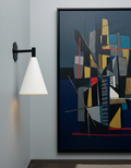 A refined balance of sculptural form and practical function, this Plaster Cone Wall Light features a finely turned brass stem and precision-machined brass backplate. The metalwork is finished in a deep, very dark satin bronze patina, adding warmth and understated luxury to its minimalist silhouette.